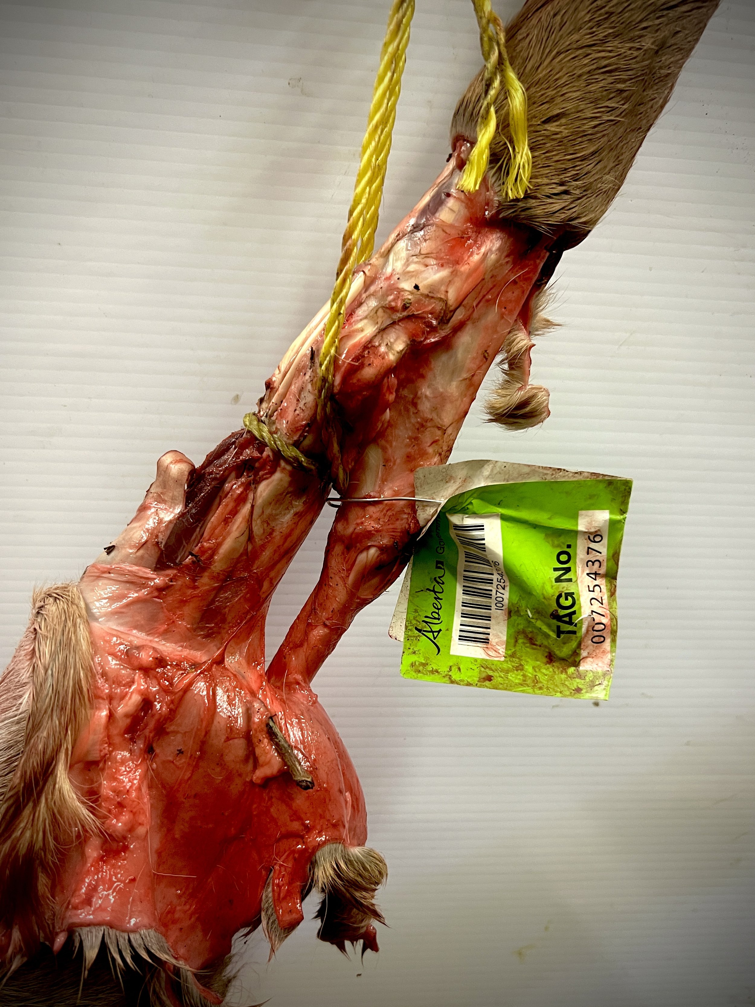 Before I placed my tag on the rear leg tendon, I completely clear the hide and the leg gland from the tagging area. This area is where I will eventually place my hoisting lines on the leg bone. This makes hoisting easier when it is done in advance.