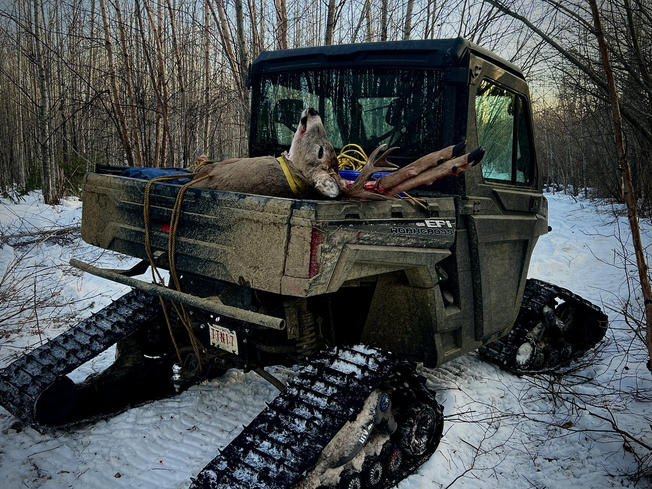 As stated, due to physical restrictions I had to be very clinical where I put my resources. I had to use time and patience to accomplish small physical goals daily. Knowing that it is the process of hunting I love more that the pulling of the trigger, I started by planning my trails. I am Blessed that I have several Whitetail right at my house. I do not need to load or transport my side by side anywhere. I can just leave from my house, and within minutes head back up in to the hills overlooking the lake. I started by cutting my forestry trails in later September. I used Ruffed Grouse hunting as my reason to drive down the very isolated overgrown cutlines. I put a lot of time and effort in to trail maintenance this year. I value having trails completely cleaned and clear of obstructions. The pure physical effort that was required to do this was actually getting me physically ready for when I harvested a deer. Although the main reason I clear trails is for comfort, the added value having no obstacles in urgent times, or when the game is down, is priceless. Day my day, trip by trip, I continued to cut my way in to what has been historically some outstanding whitetail deer territory. One of the best part is that with my side by side on tracks, I could climb, what would would turn out to be, the snow covered hills in to places where other ATV’s would be limited. Along the way I would harvest a few Ruffed Grouse and then be ready for when the deer rut of November would be begin.