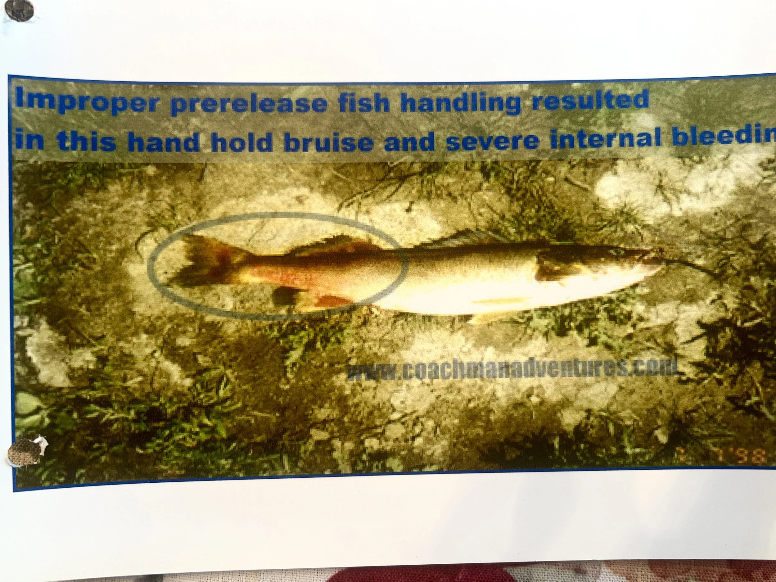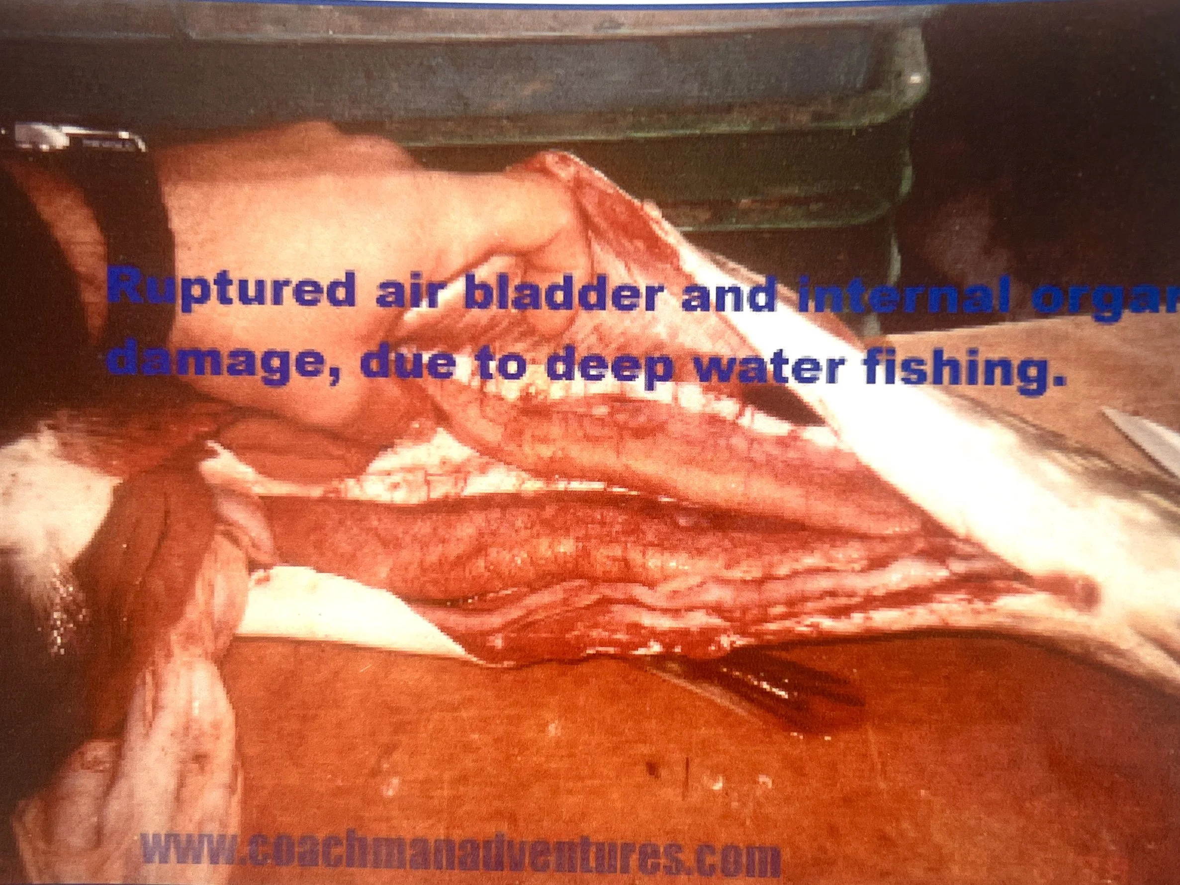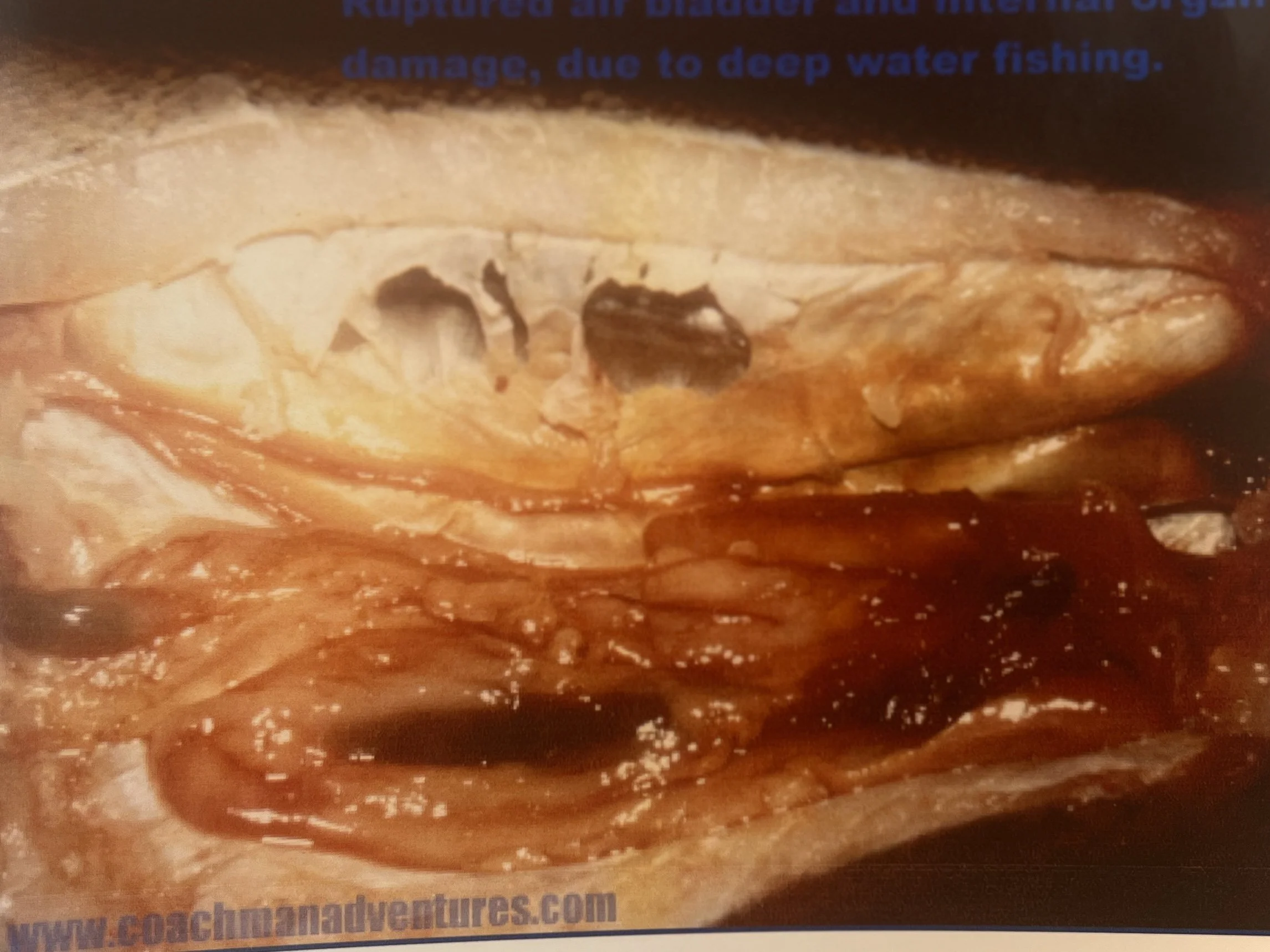 This is massive hypovolemia. Rough handling was over squeezing is suspect. The use of wet, cotton gloves prevents over squeezing, as well as the transfer of bacteria. Unfortunately one of the pictures that I once had, actually had finger / palm marks where a Walleye was held with a bare hand.