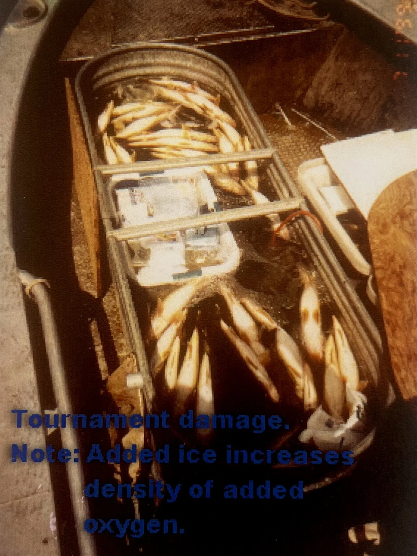This picture was taken many, many years ago at one of our local fishing tournaments. This was one of the tubs that contained dead walleye from one of the holding cells. Every one was processed for food after the cause of death was determined. Today, the lessons learned from these historic findings have been implemented. Several changes have been adapted. These recommendations, when actively used, will mitigate any loss of life associated with live releases.