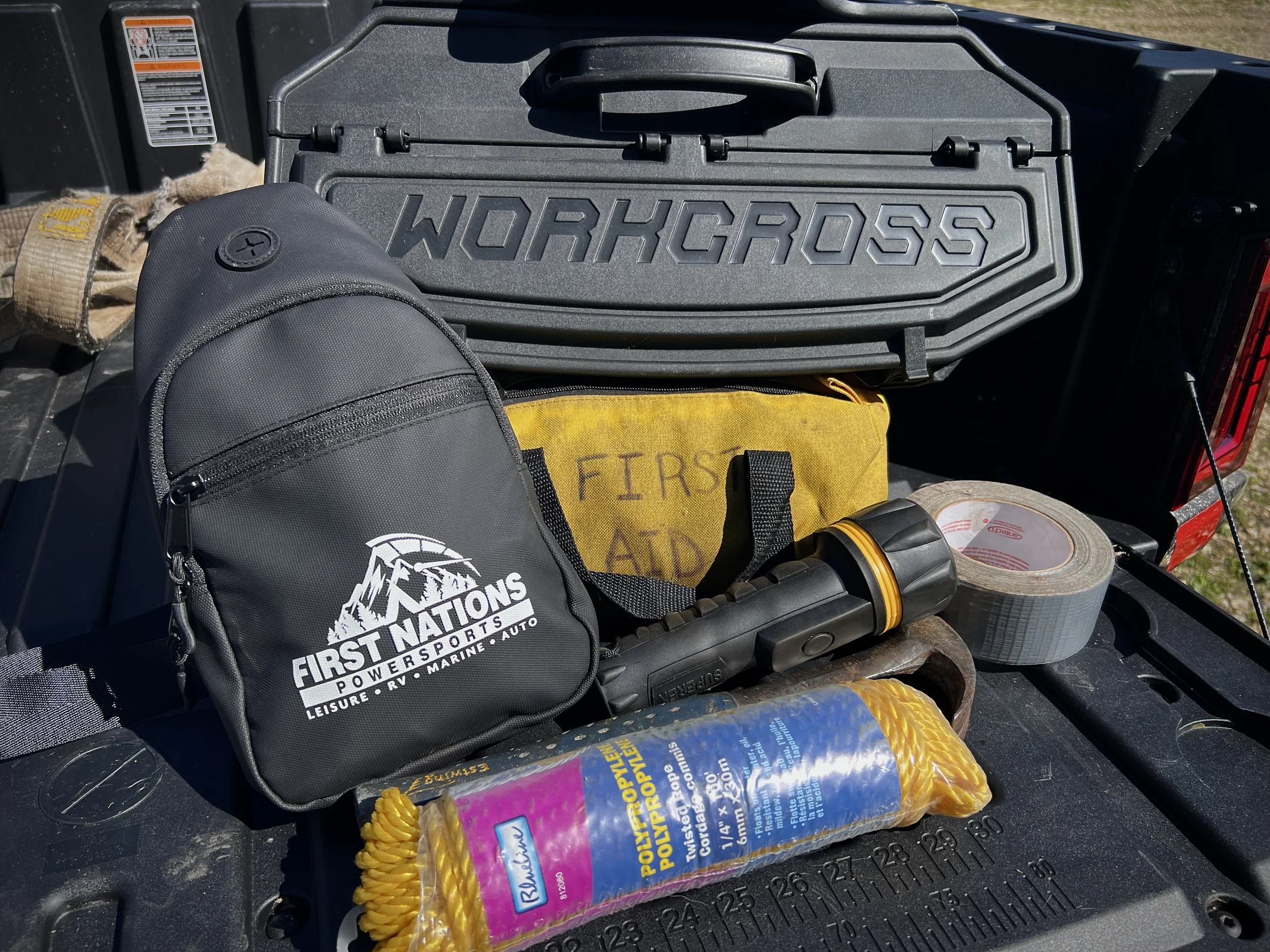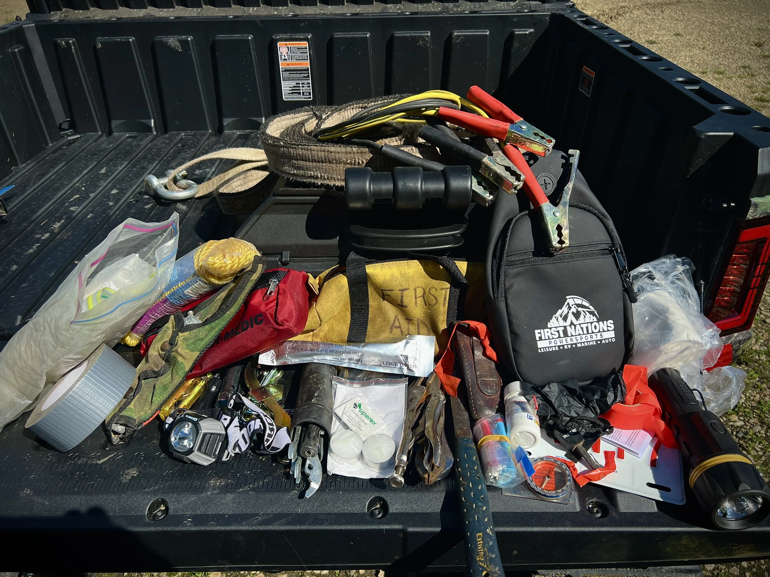 Emergency First Aid Kit, Assorted ATV tools, Wilderness Survival Gear, Water Pot, Tow ropes, Jumper Cables, Waterproofed Toilet paper, License and Registration. All are packed and ready for immediate use.