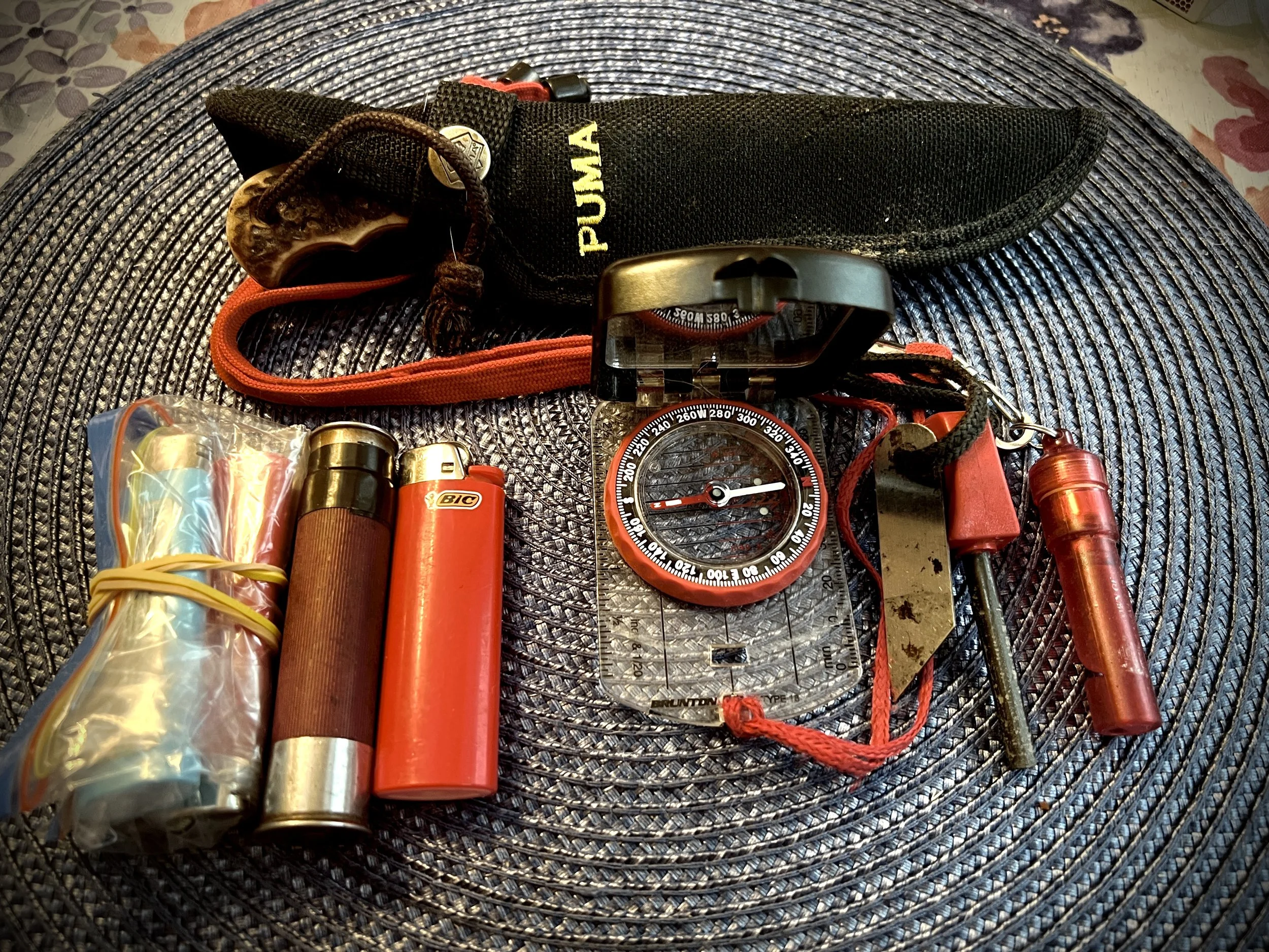I have Waterproofed Lighters, Knife, Waterproofed Matches in my 16-20 gauge case, Compass, Flint and Steel, and Whistle on my person.