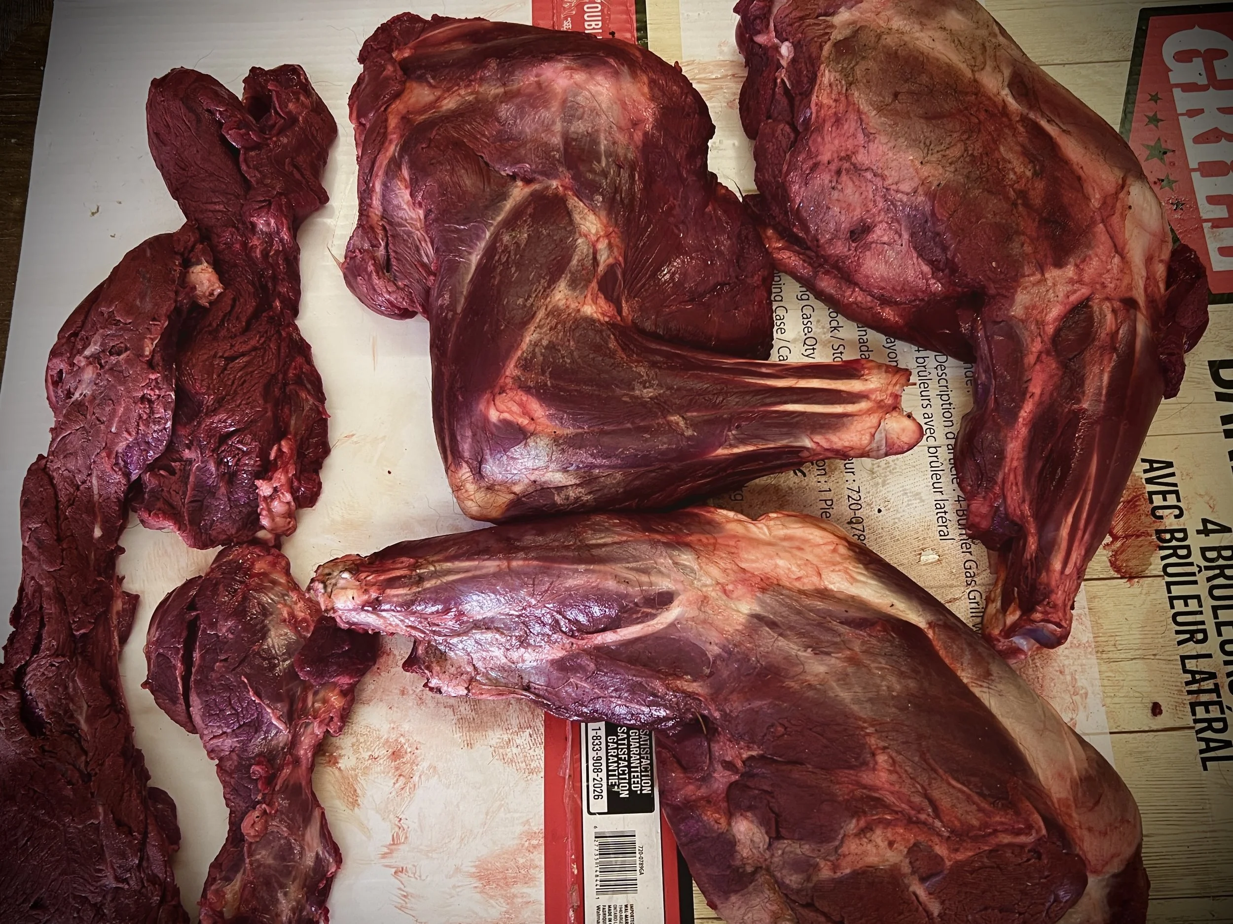 I placed the backstraps , front shoulder, and both back shoulders on to a clean piece of cardboard for deboning. I am not a professional butcher. Honestly, I am looking forward to learning with friends like Kevin McNeil with Canadian Wildlife Adventures and Brad Fenson with Harvest Your Own. Both are an excellent resources. When I know better I will do better, and love the learning in the process.