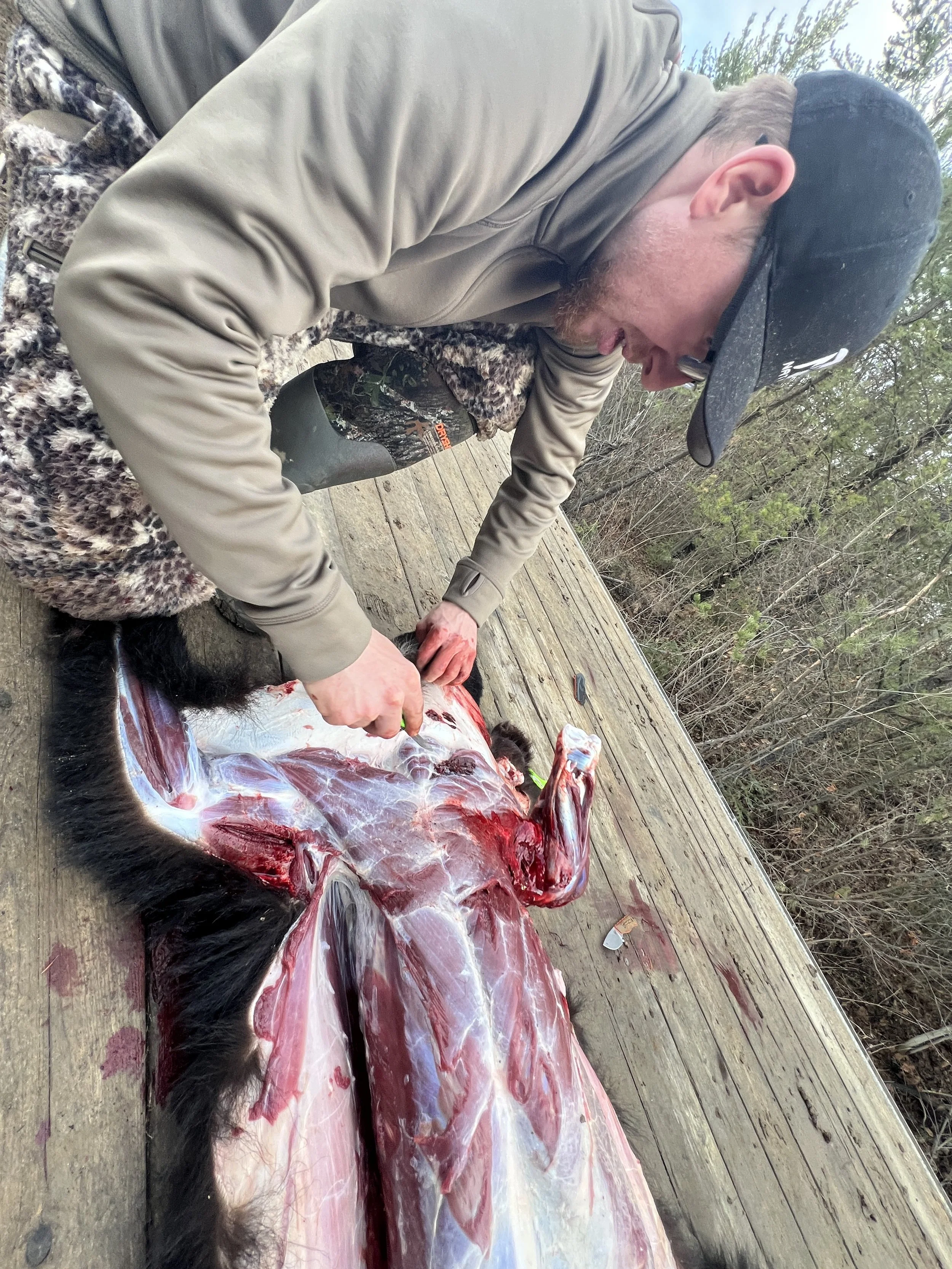 Brody is just finishing up the “I cut” technique on the bear. He is using special precautions to protect the bears white patch, by rolling the hide until the base of the bears skull is exposed.