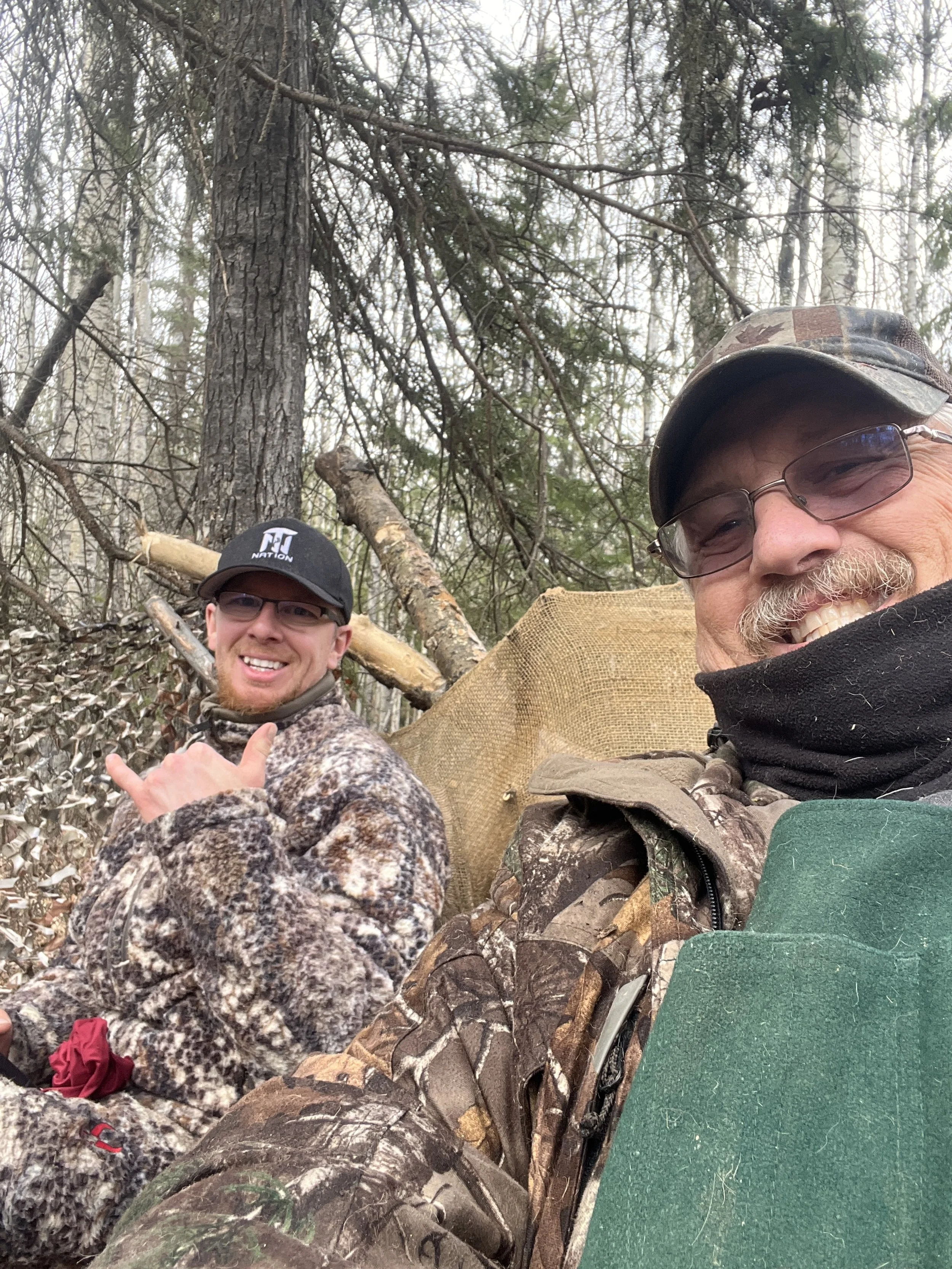 Brody and Keith are inside their ground blind. Unfortunately, the young bear was in it just moments earlier. Safety was a definite concern. A tree stand approach would have been safer.