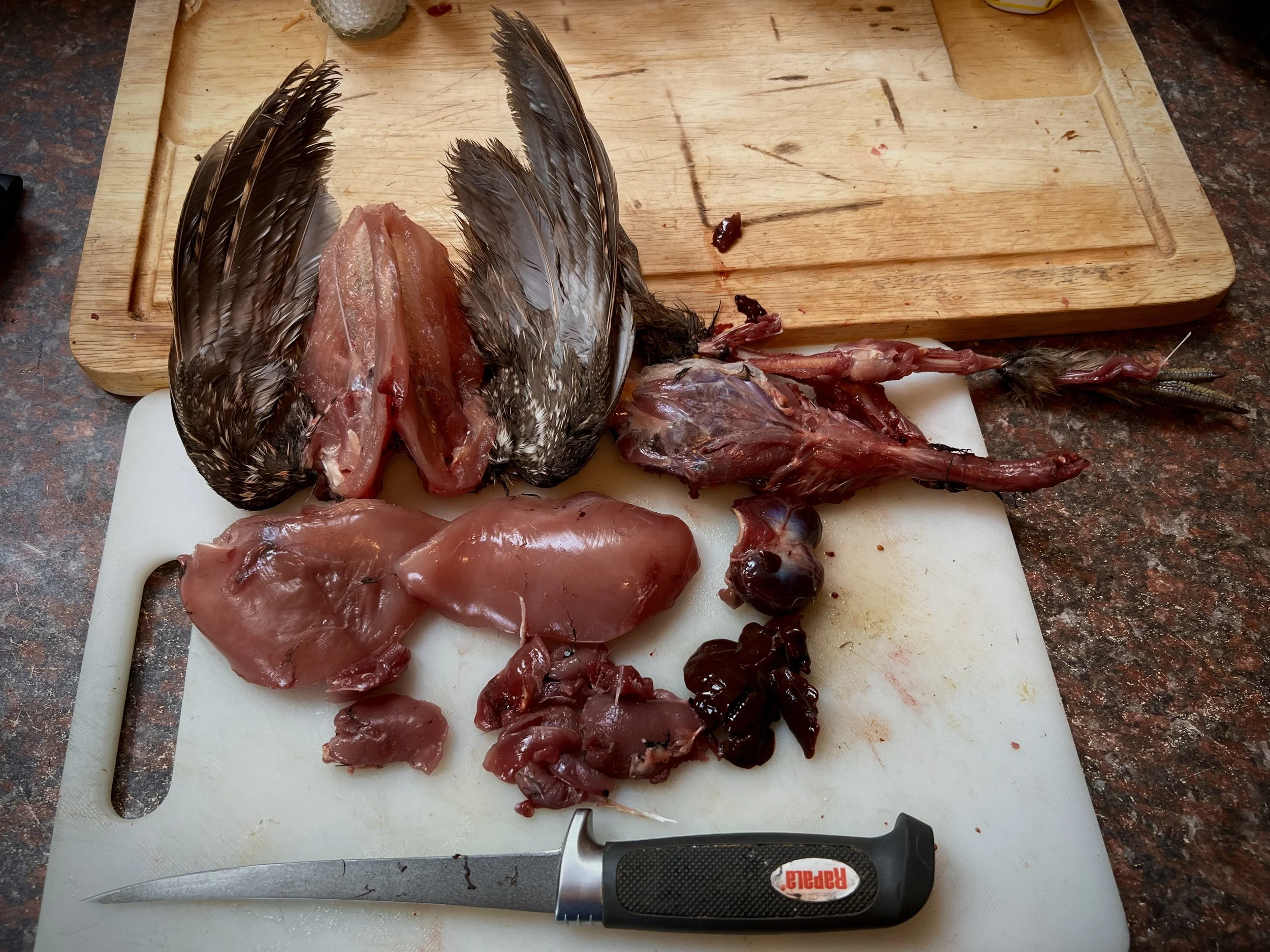 This is how I bring my freshly harvested Ruffed Grouse inside my residence to be more thoroughly cleaned. It is the breast meat attached with the wings, with the back, legs, heart, liver and gizzard included.
