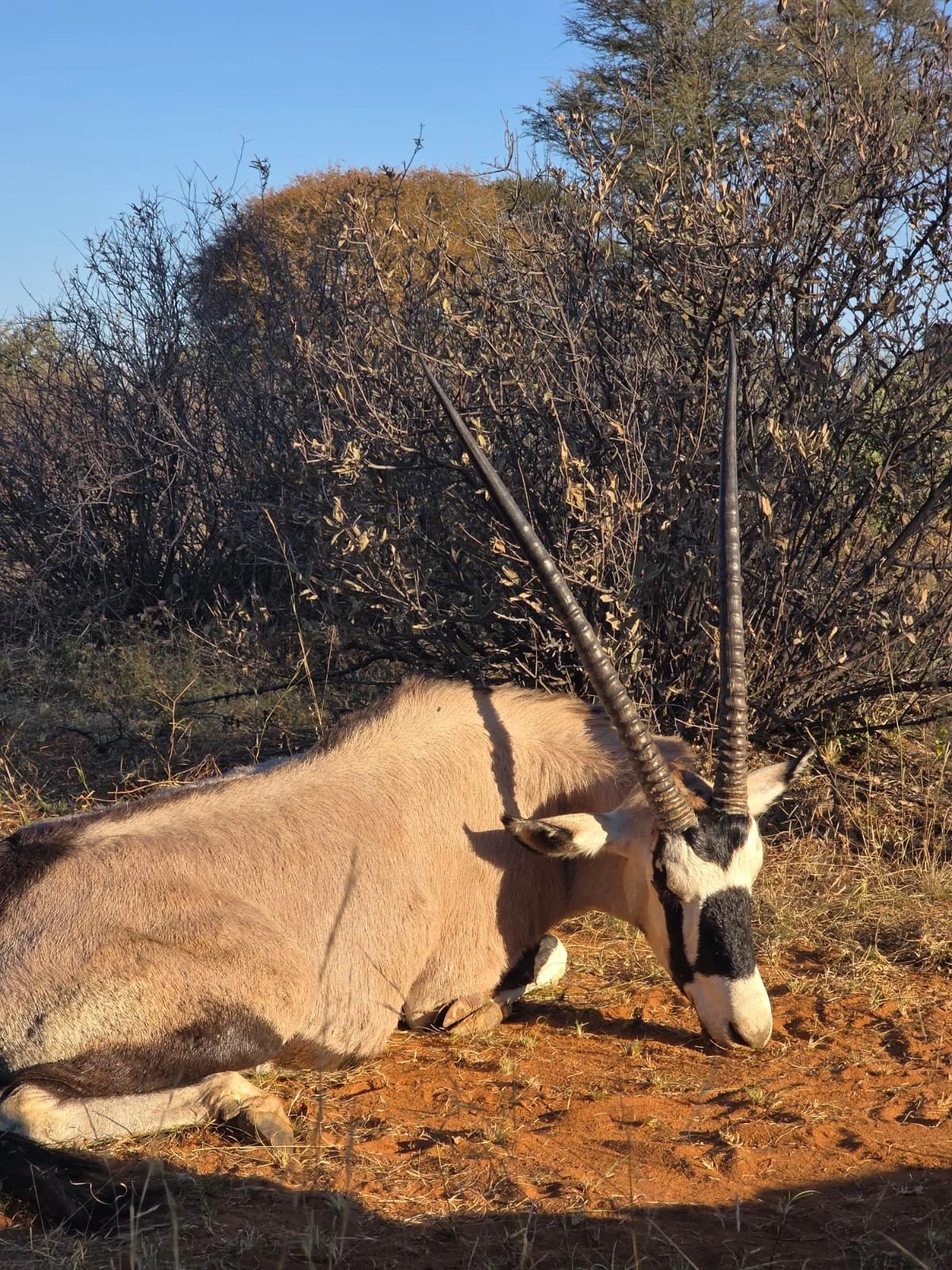 We pressed on into a dense thicket, and there he was—a magnificent gemsbok bull, standing broadside but partially obscured. I had to visualize the vitals. I took the shot. The bull dropped low and ran.