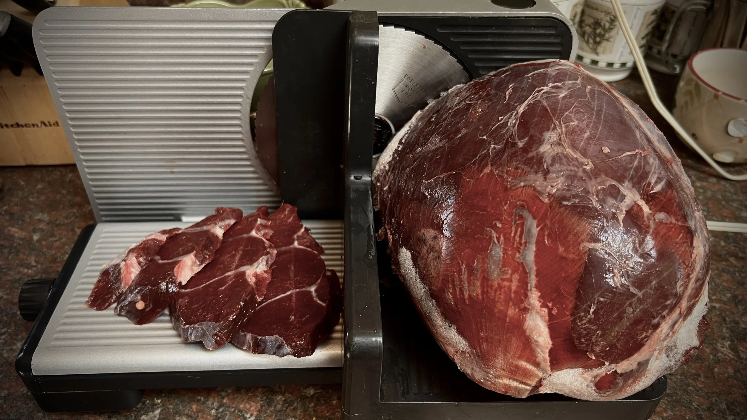 I was using a meat slicer to slice the partially frozen Elk roast in to approximately ¼ inch slices.