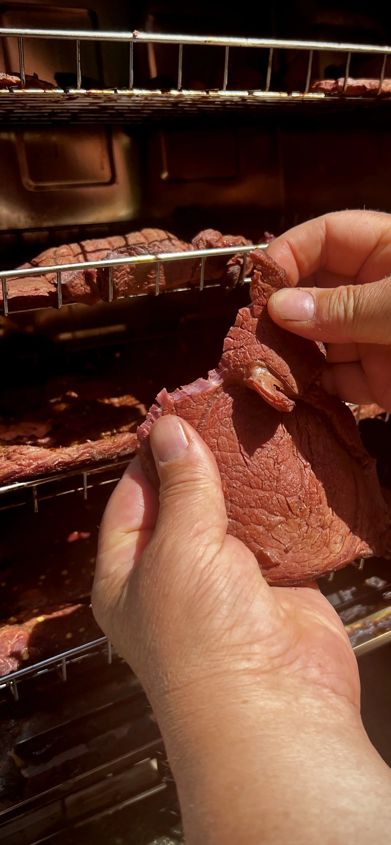 Tearing the jerky is another way of determining if it is done. White muscle fibers should show when the jerky is near completion.