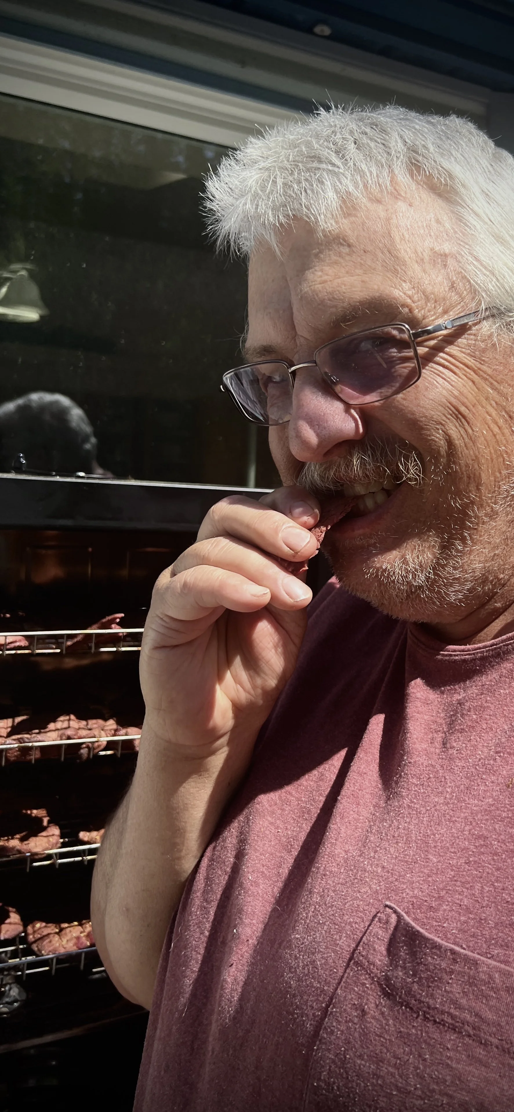 Keeping the smoker between 170 F - 200 F was easy with the electric temperature controls and the automatic bisquettes feeder. Mesquite was smoke of choice this time. Hickory smoke would be my second choice. Overall time in the smoker was slightly over three hours for the jerky, 1.5 hours for the fish.