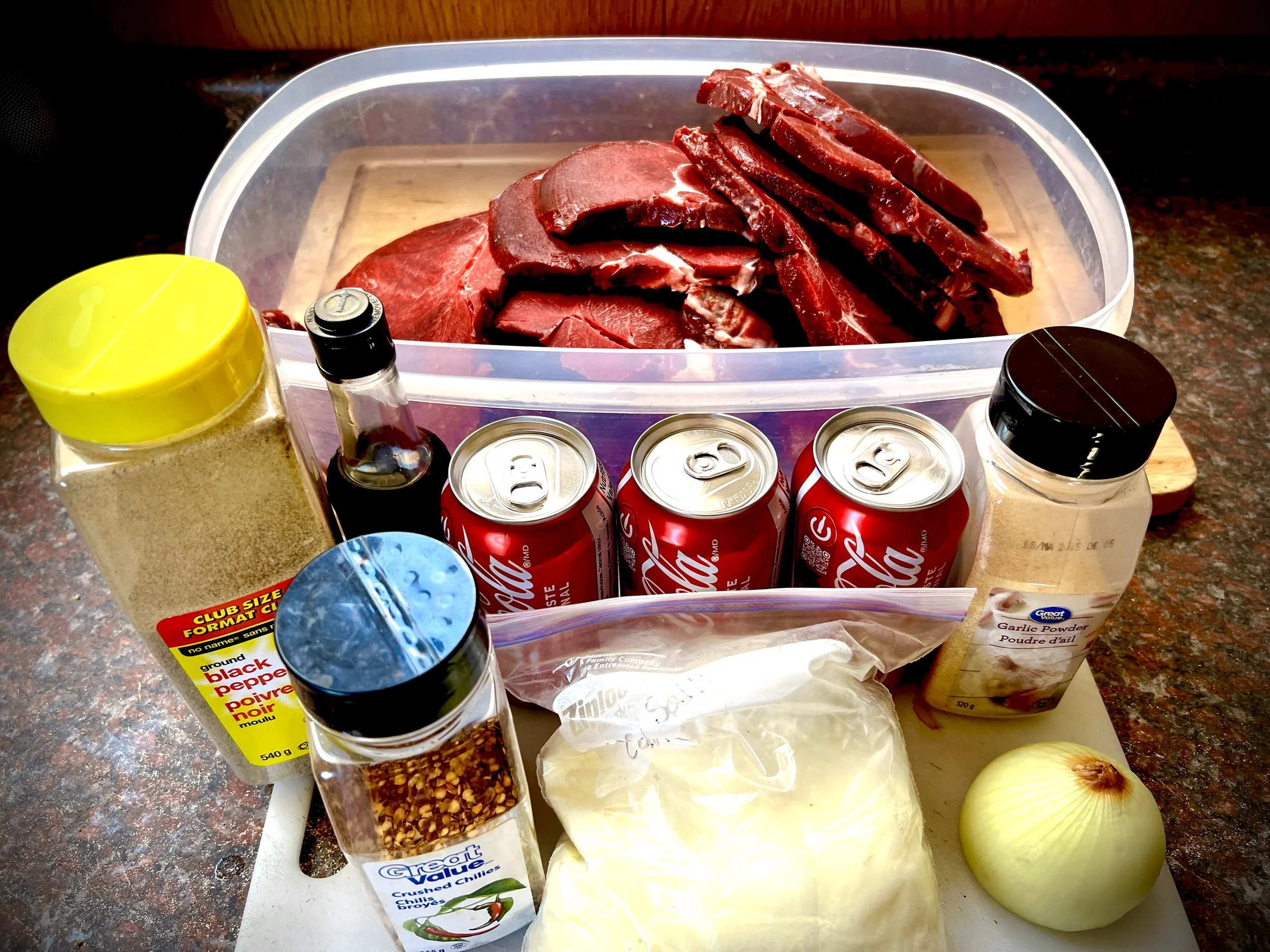 These are some base ingredients for a Wild Game jerky recipe. I borrowed, and slightly adapted, the recipe and procedure found on the “Harvest Your Own “ website with Brad Fenson.