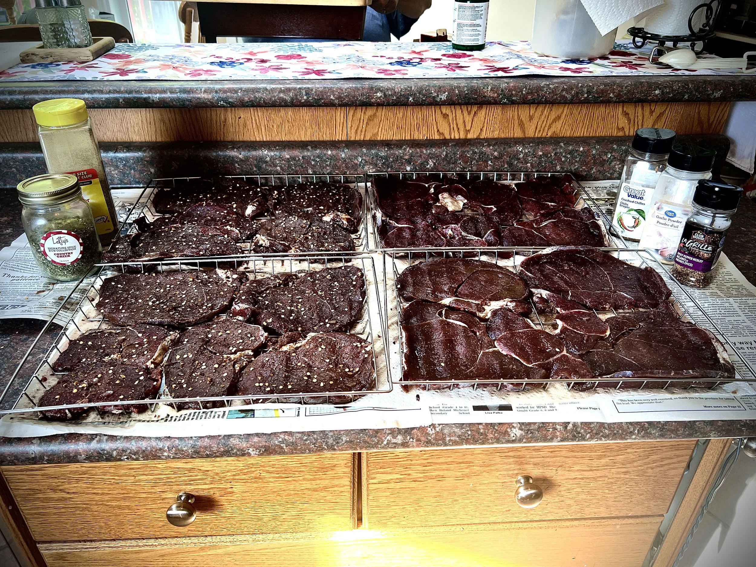 After a 24 hour marinate, the Elk meat was spread out over a old newspaper / paper towel backdrop, padded dry and then let air dry for roughly one hour before I put in the smoker. I lightly sprinkled half of my jerky with a Spiced Pepper Medley, half was Crushed Chili Blend.